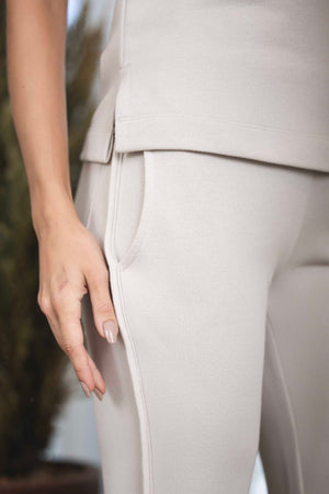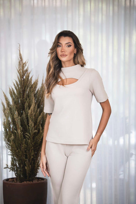O conjunto Allure é composto por calça reta com elástico na cintura, viés nas laterais, com bolsos laterais e na parte traseira da calça também e barra assimétrica. Blusa com mangas curtas, recorte vazado no decote com detalhe em malha de ribana. Uma proposta rica em detalhes. Um modelo lindo de conjunto que facilita nosso momento de vestir. É a escolha perfeita para mulheres que buscam unir sofisticação e conforto em um só look. Ideal para viajar com uma roupa que não incomoda e te deixa pronta. Com um design elegante e atemporal, esse conjunto combina a praticidade de uma produção linda e versátil para diversas ocasiões. Confeccionado com malha premium e sustentável de alta qualidade, o moletom oferece beleza, corte em alfaiataria e caimento perfeito, sem abrir mão da feminilidade.