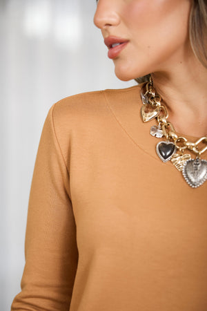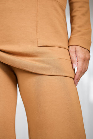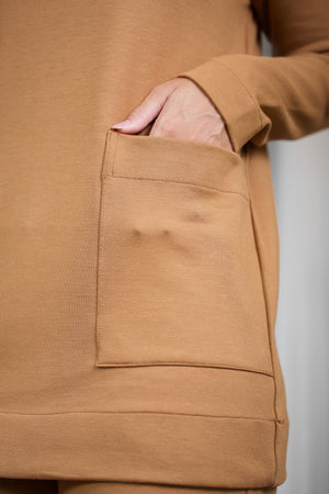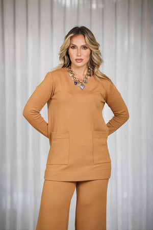 A blusa com modelo reto tipo túnica, possui bolsos na frente, tem mangas longas, decote redondo e veste você em momentos casuais, viagens e várias ocasiões. É um conjunto com visual elegante e descomplicado.