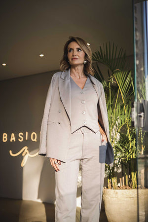 O conjunto Milão é um terno em alfaiataria composto por 3 peças: calça reta com cós de zíper e botão na cintura, com bolsos laterais e na parte traseira da calça também. Blazer forrado com mangas longas, punhos com botões, e colete com botões frontais. Uma proposta rica em detalhes. Um modelo lindo de terno que alia sofisticação, praticidade e o conforto da malha. Transita por diferentes compromissos e facilita nosso momento de vestir. É a escolha perfeita para mulheres que buscam unir sofisticação e conforto em um só look. Ideal para viajar com uma roupa que não incomoda e te deixa pronta. Com um design elegante e atemporal, esse conjunto combina a praticidade de uma produção linda e versátil para diversas ocasiões. Confeccionado com malha premium e sustentável de alta qualidade, o moletom oferece beleza, corte em alfaiataria e caimento perfeito, sem abrir mão da feminilidade.