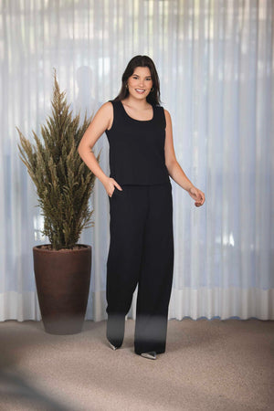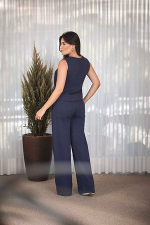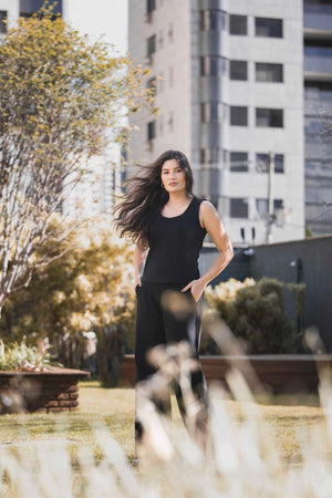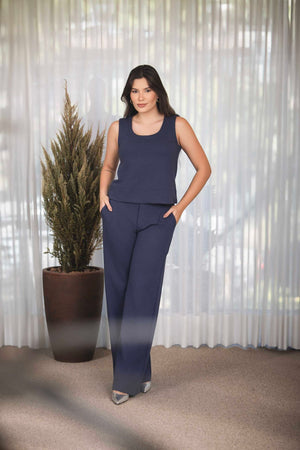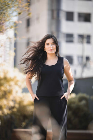 O conjunto Minimalista é composto por calça reta com elástico na cintura na parte das costas, pregas a partir do cós na parte da frente, zíper lateral, com bolsos laterais e na parte traseira da calça também. Blusa reta sem mangas, e decote redondo. Uma proposta chic e clean. Um modelo lindo de conjunto em corte alfaiataria que facilita nosso momento de vestir. É a escolha perfeita para mulheres que buscam unir sofisticação e conforto em um só look. Ideal para viajar com uma roupa que não incomoda e te deixa pronta. Com um design elegante e atemporal, esse conjunto combina a praticidade de uma produção linda e versátil para diversas ocasiões. Confeccionado com malha premium e sustentável de alta qualidade, o moletom oferece beleza, corte em alfaiataria e caimento perfeito, sem abrir mão da feminilidade.