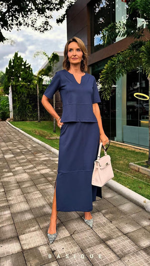 A saia tem comprimento máxi MIDI com bolsos laterais e recortes com fendas, e a blusa decote V e recortes, mangas curtas e corte reto.