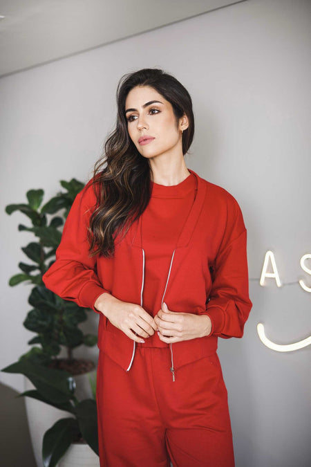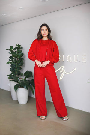 O conjunto Rouge é composto por 3 peças, sendo elas: calça reta com elástico na cintura, com bolsos laterais e na parte traseira da calça também, blusa sem manga e jaqueta com mangas longas, punhos largos, zíper frontal. Uma proposta rica em detalhes. Um modelo lindo de conjunto que facilita nosso momento de vestir. É a escolha perfeita para mulheres que buscam unir sofisticação e conforto em um só look. Ideal para viajar com uma roupa que não incomoda e te deixa pronta. Com um design elegante e atemporal, esse conjunto combina a praticidade de uma produção linda e versátil para diversas ocasiões. Confeccionado com malha premium e sustentável de alta qualidade, o moletom oferece beleza, corte em alfaiataria e caimento perfeito, sem abrir mão da feminilidade.
