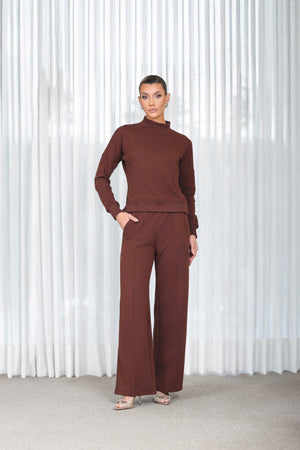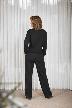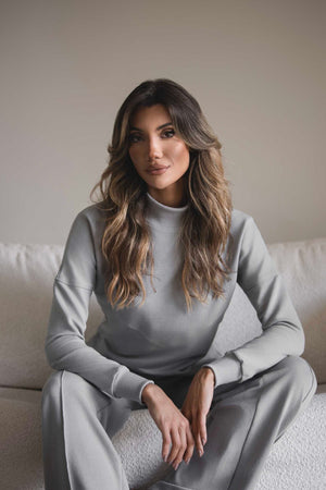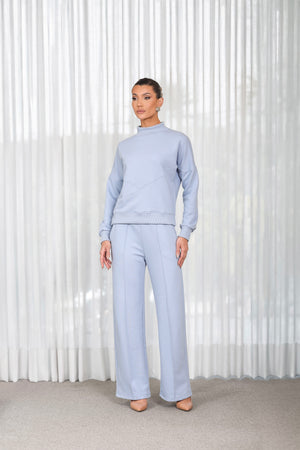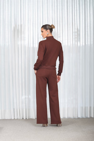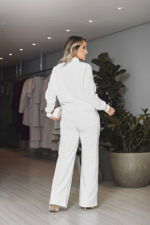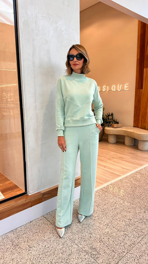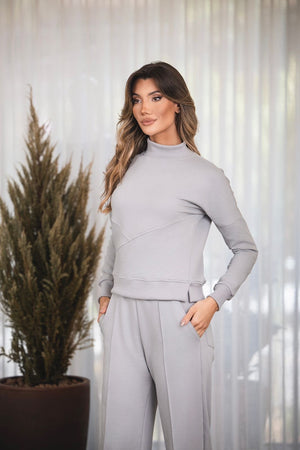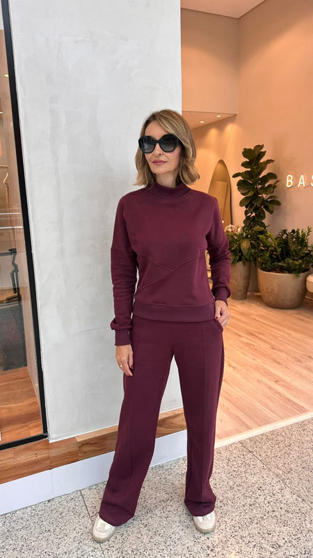 Composto por uma calça reta com elástico na cintura, bolsos laterais e traseiros, e uma blusa com recortes estratégicos e punhos de ribana, o Conjunto Voyage traz uma proposta rica em detalhes, pensada para valorizar a silhueta e facilitar o momento de vestir.