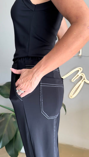 O Macacão Urbano tem um modelo lindo e rico em detalhes com decote redondo estilo camiseta e viés da mesma cor, pesponto de costuras em branco ao longo da peça. Calça reta com bolsos laterais e atrás também, é a escolha perfeita para mulheres que buscam unir sofisticação e conforto em um só look. Com um design elegante e atemporal, esse macacão combina a praticidade de uma produção pronta que alia elegância criando uma proposta chique, casual e versátil para diversas ocasiões. Confeccionado com malha premium e sustentável de alta qualidade, com viscose e elastano, oferece leveza e caimento perfeito, sem abrir mão da feminilidade.