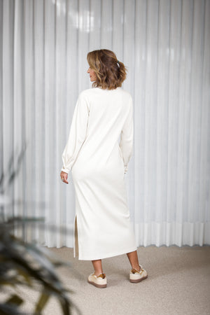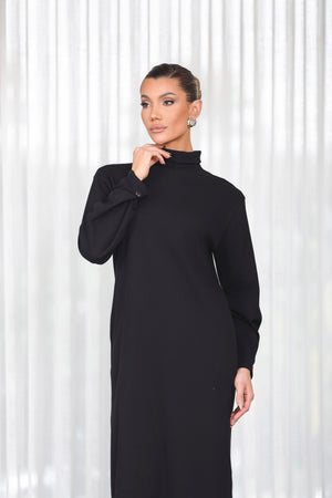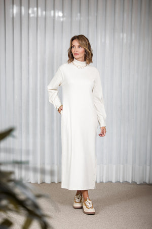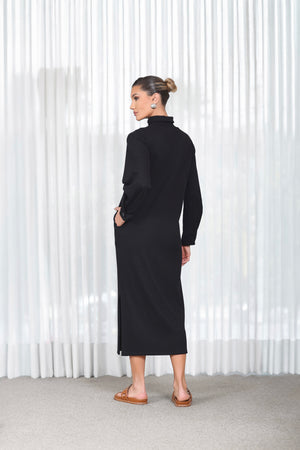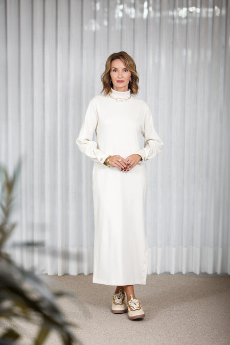 Com gola mais alta, mangas longas e detalhes delicados de botões, o Vestido Comfy combina elegância e praticidade em uma única peça. As fendas laterais sutis adicionam leveza e movimento, tornando-o ideal para acompanhar a rotina em qualquer ocasião.